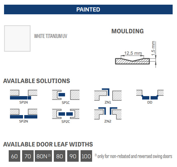 - door leaves and door frames coated with water-based UV hardened varnish for high resistance to adverse use conditions