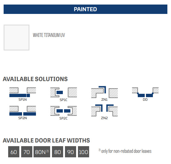 - door leaves and door frames coated with water-based UV-hardened varnish for high resistance to adverse use conditions