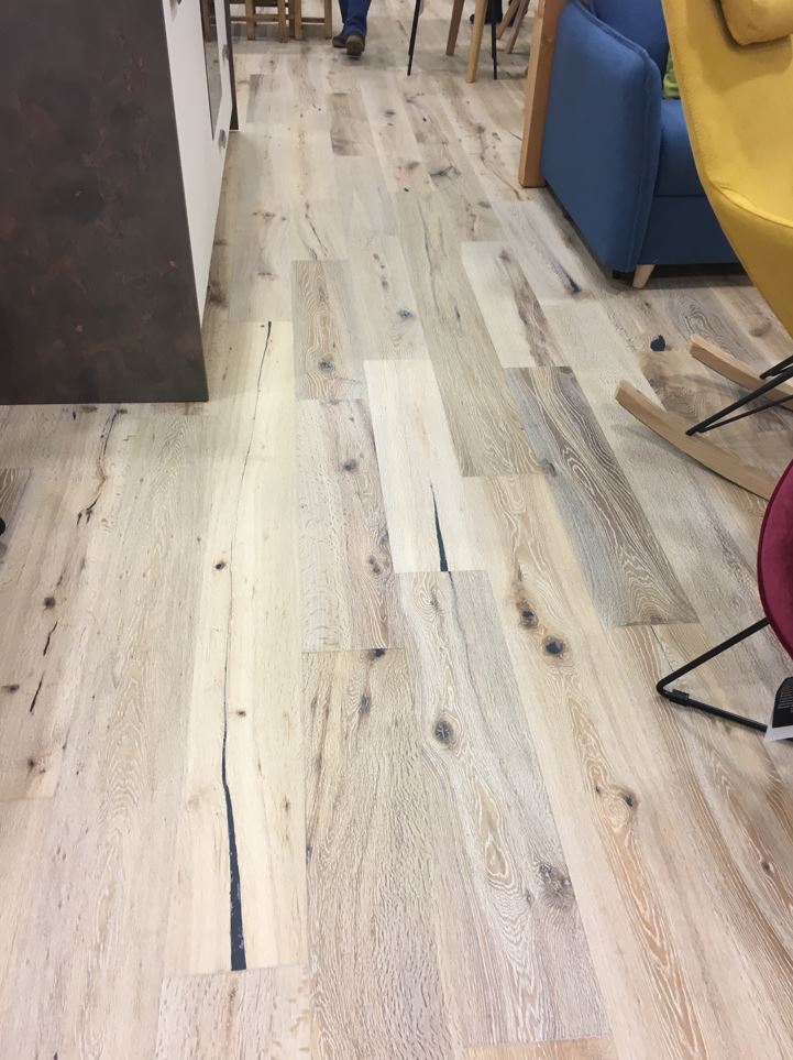 Classical 1-plank flooring in thickness 14 mm, approx. 3 mm oak top layer, brushed UV White oiled oak, rustic grade, underfloor heating suitable