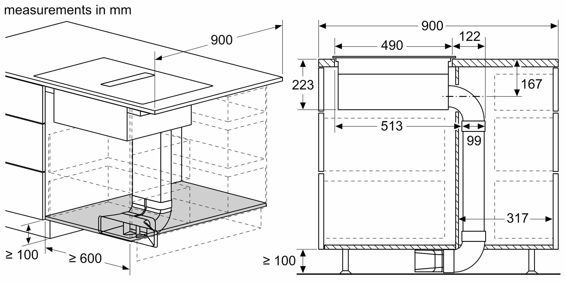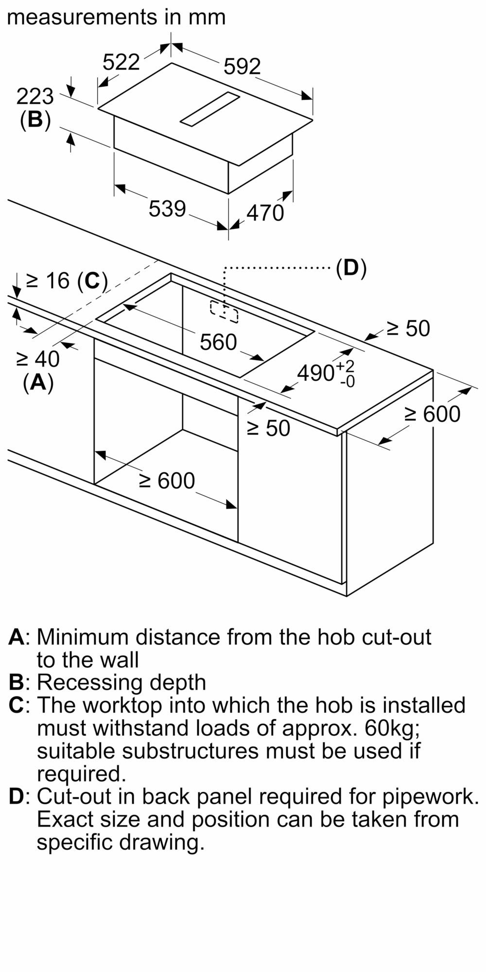 - Minimum width for installation: 560 mm