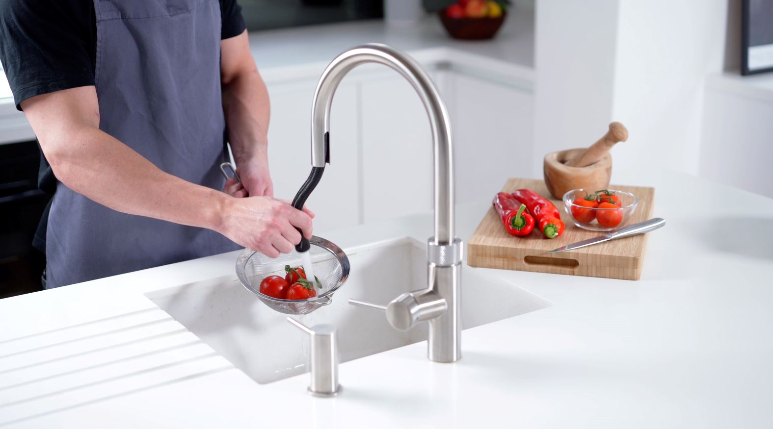 Quooker FLEX taps - The Flex is a boiling water tap, equipped with a flexible pull-out hose for hot, cold and boiling water. This makes it very easy to rinse and clean at any point in the sink. The Quooker Flex can never dispense boiling water when the pull-out hose is extended. This makes the tap 100% safe to use. Tea leaves, the membrane from orange segments, grains of sand: whatever might be stuck to your sink, you can use the pull-out hose to rinse everything down the drain. That makes the Flex an ideal tool for everyone who loves a fresh kitchen.